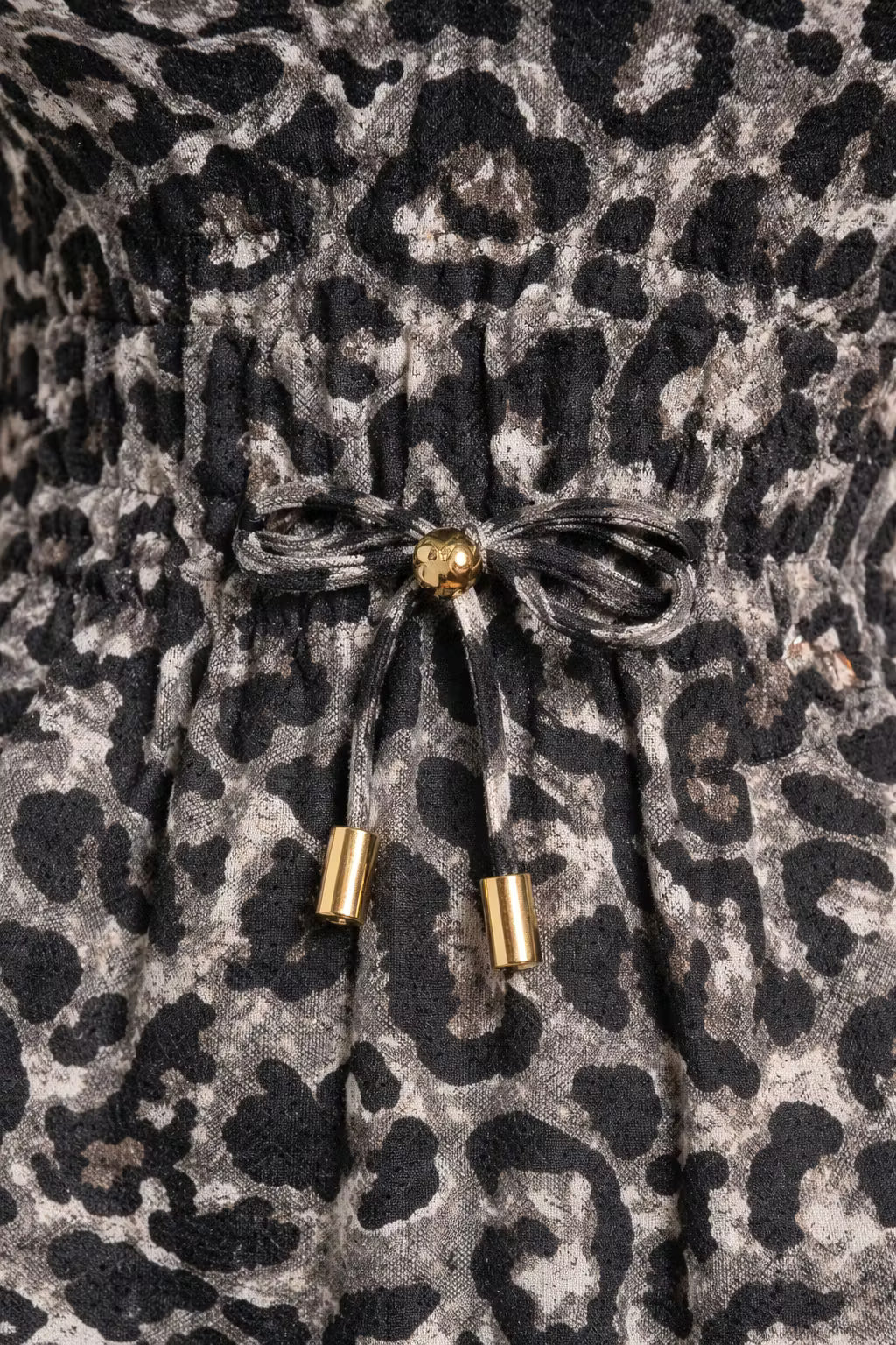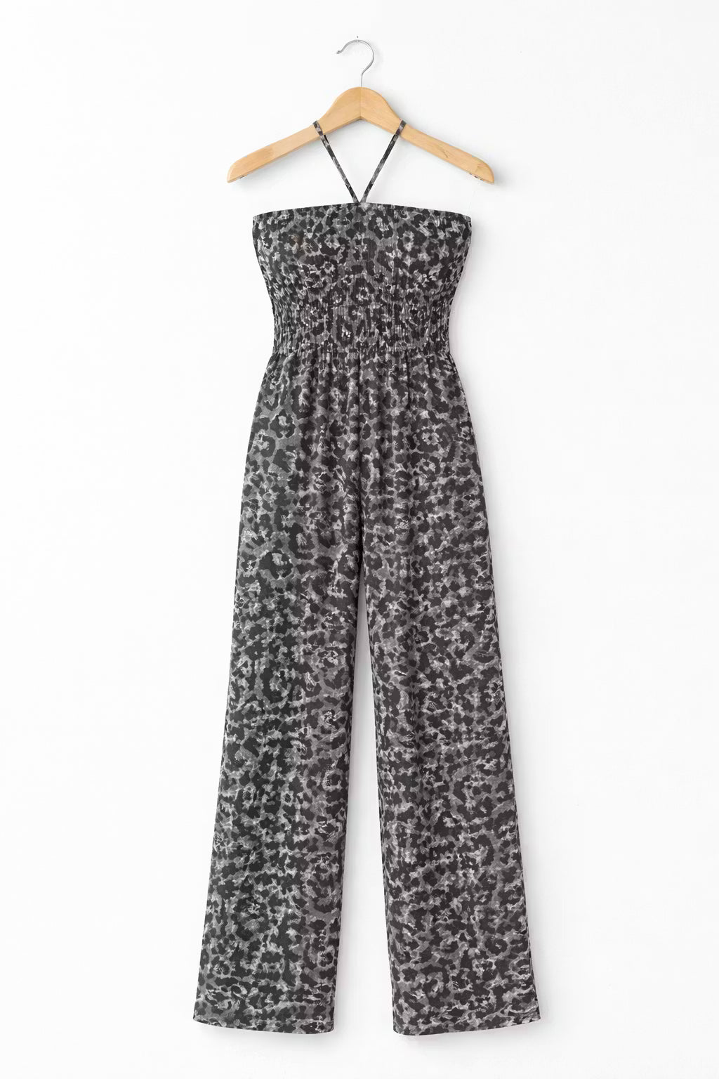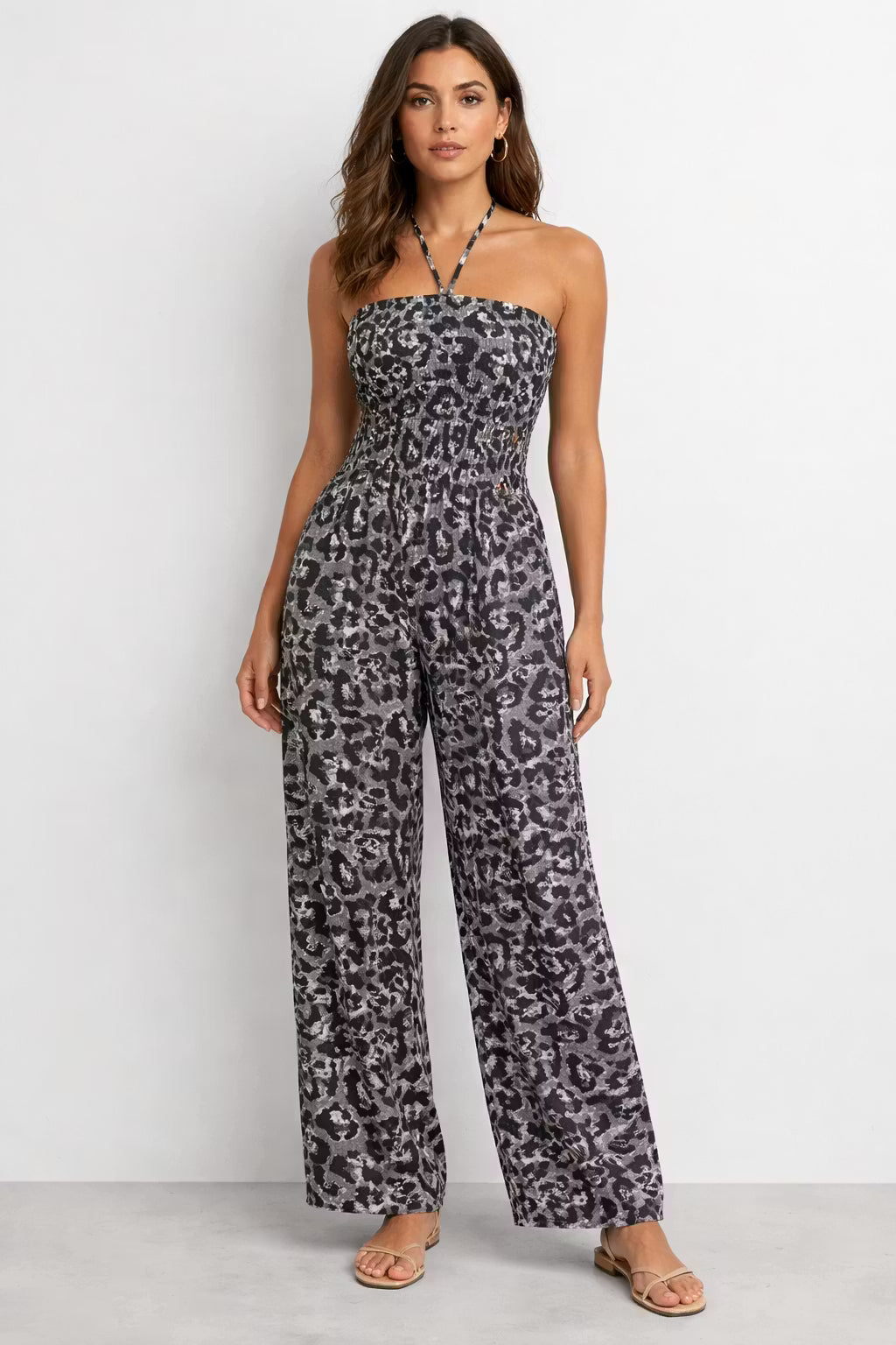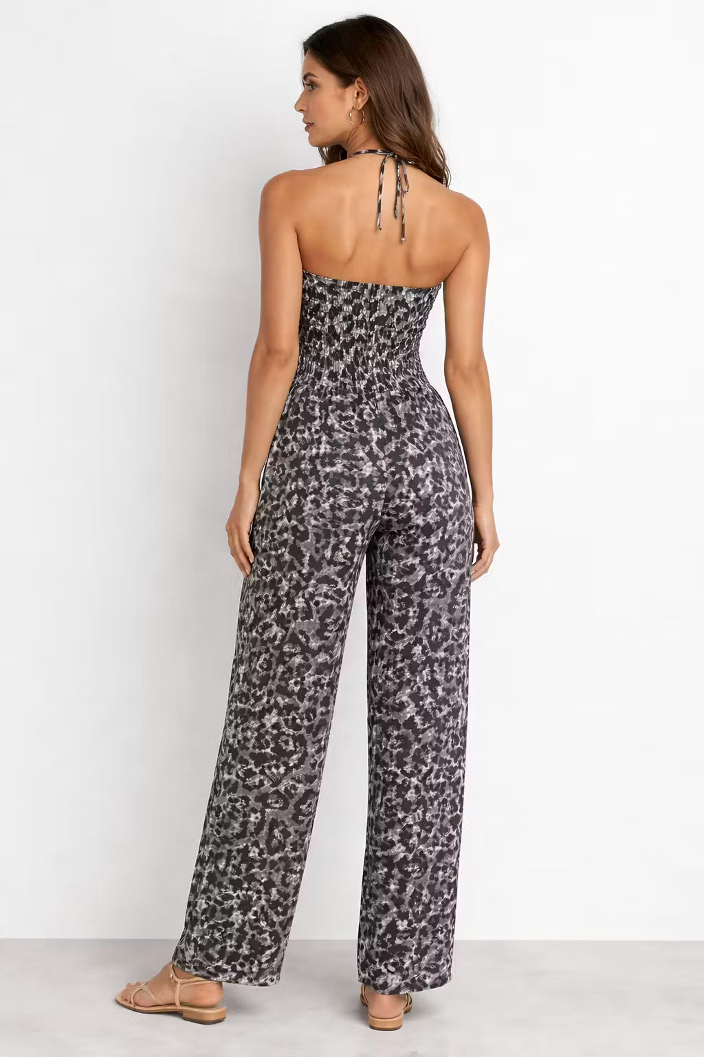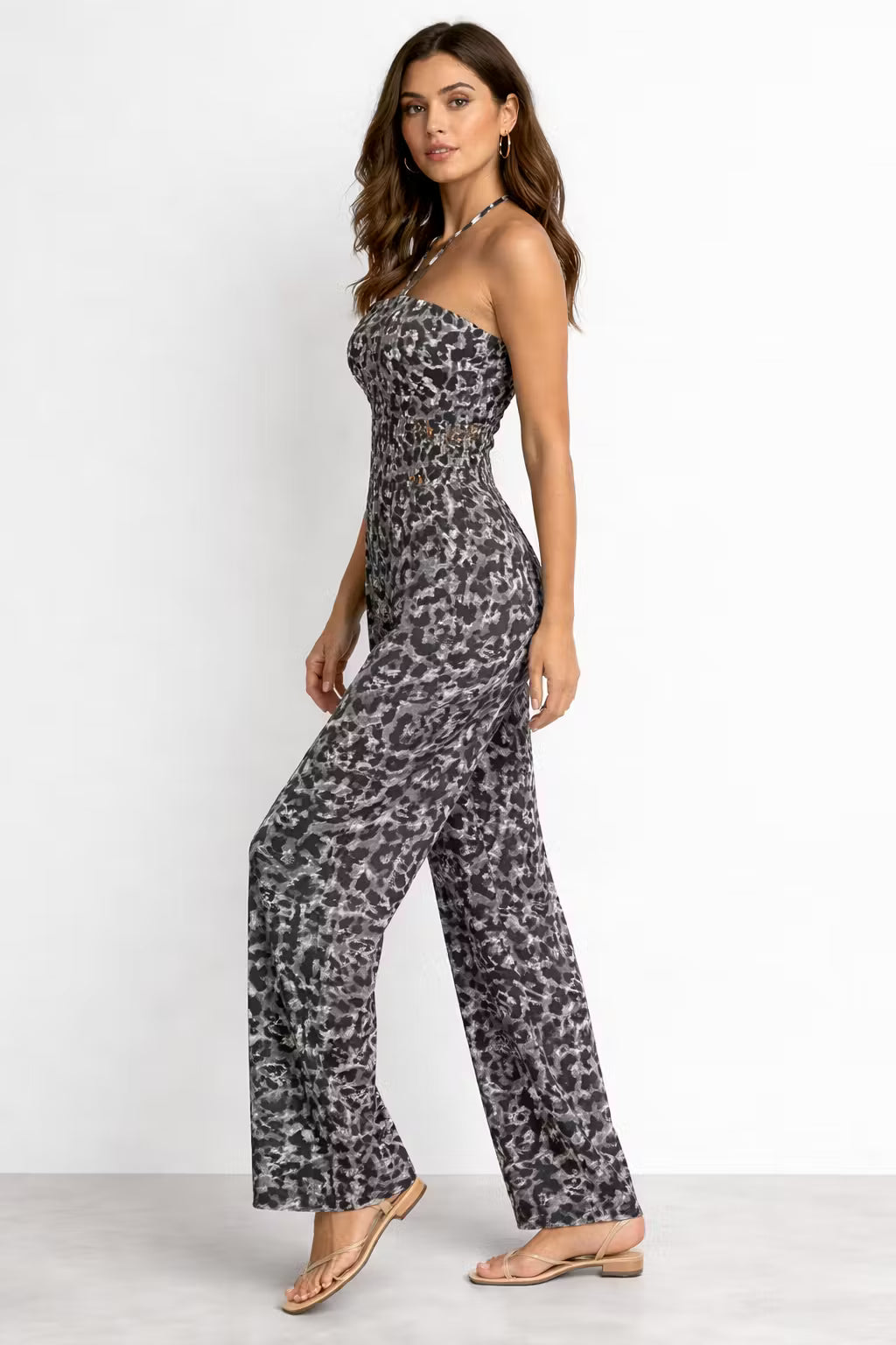 Ten bezramienny kombinezon wykonany jest z mieszanki na bazie wiskozy z nadrukiem na całej powierzchni, który tworzy wyrazisty efekt wizualny. Górna część typu bandeau podkreśla linię dekoltu, a szeroka nogawka nadaje sylwetce płynność i wydłużenie. Inspirowany trendem Playful Paradox, wprowadza wyrazistość do nowoczesnej garderoby. Przeznaczony do stylizacji na dzień oraz spotkania towarzyskie.
