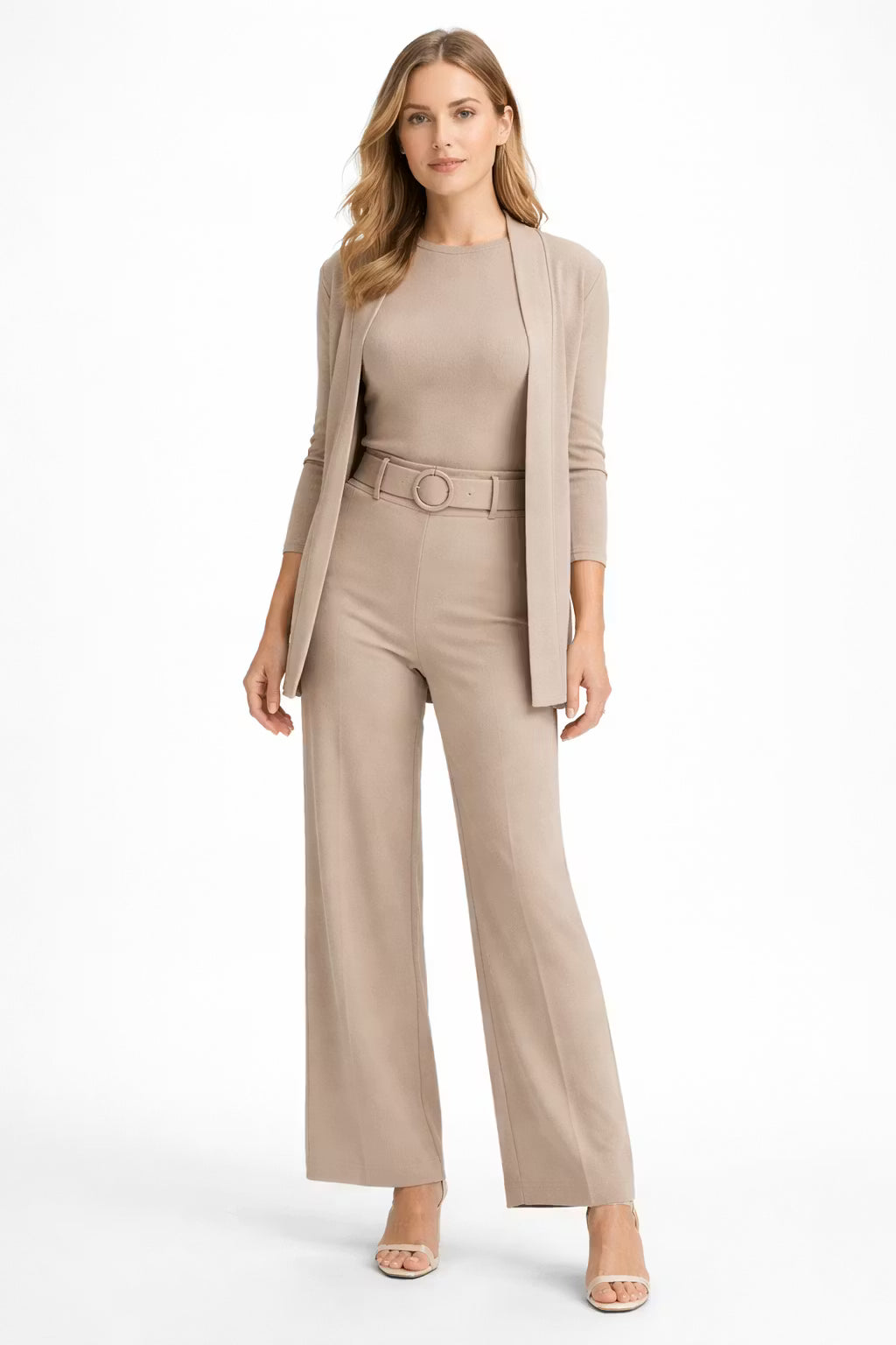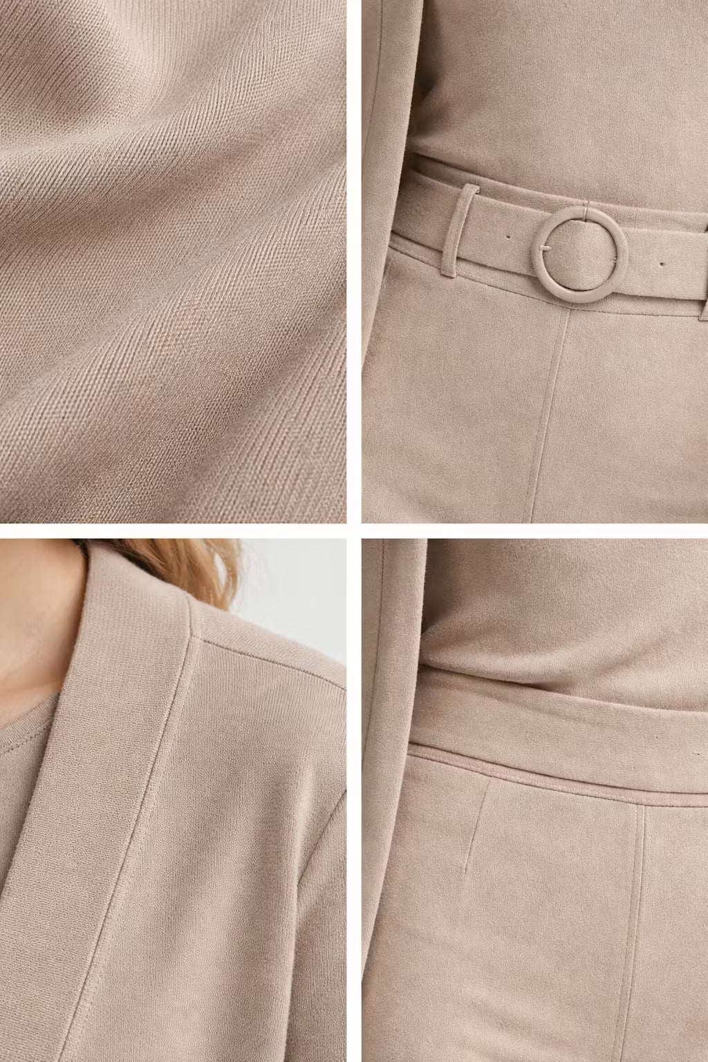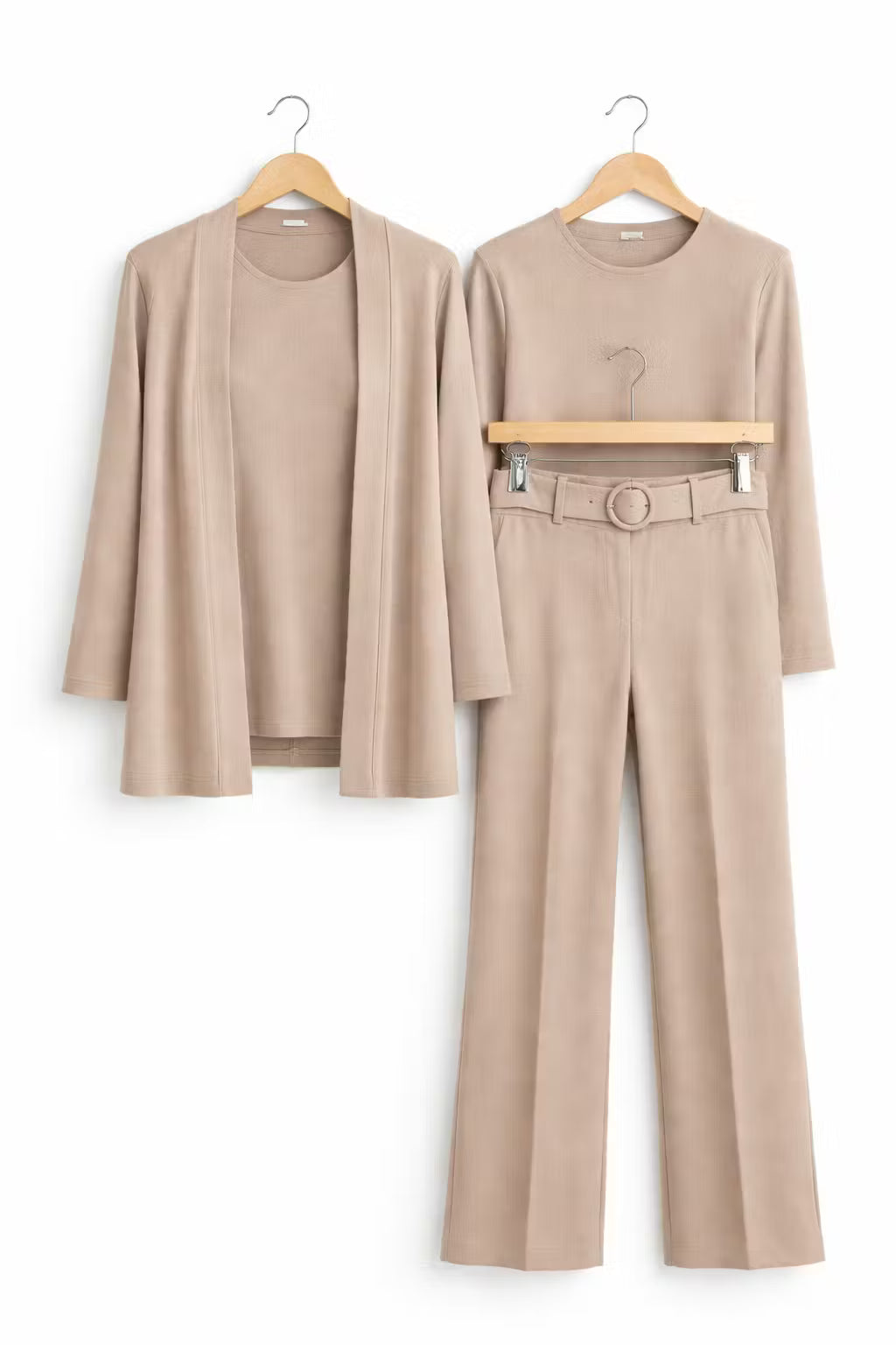 Ten damski trzyczęściowy zestaw lounge przedstawia nowoczesną interpretację minimalistycznej garderoby inspirowanej trendami Spring/Summer 2026 w Europie. Kardigan, bluzka i spodnie wykonane są z dzianiny z mieszanki wiskozy, która tworzy naturalną strukturę materiału oraz elegancki układ tkaniny. Komplet zaprojektowano z myślą o współczesnej garderobie – sprawdzi się podczas dnia w mieście, w pracy biurowej oraz w podróży. Projekt odzwierciedla estetykę New Rationalism, koncentrując się na wizualnym spokoju i nowoczesnych proporcjach. Zamówienia w Polsce obsługują płatności BLIK oraz dostawę do paczkomatów InPost.