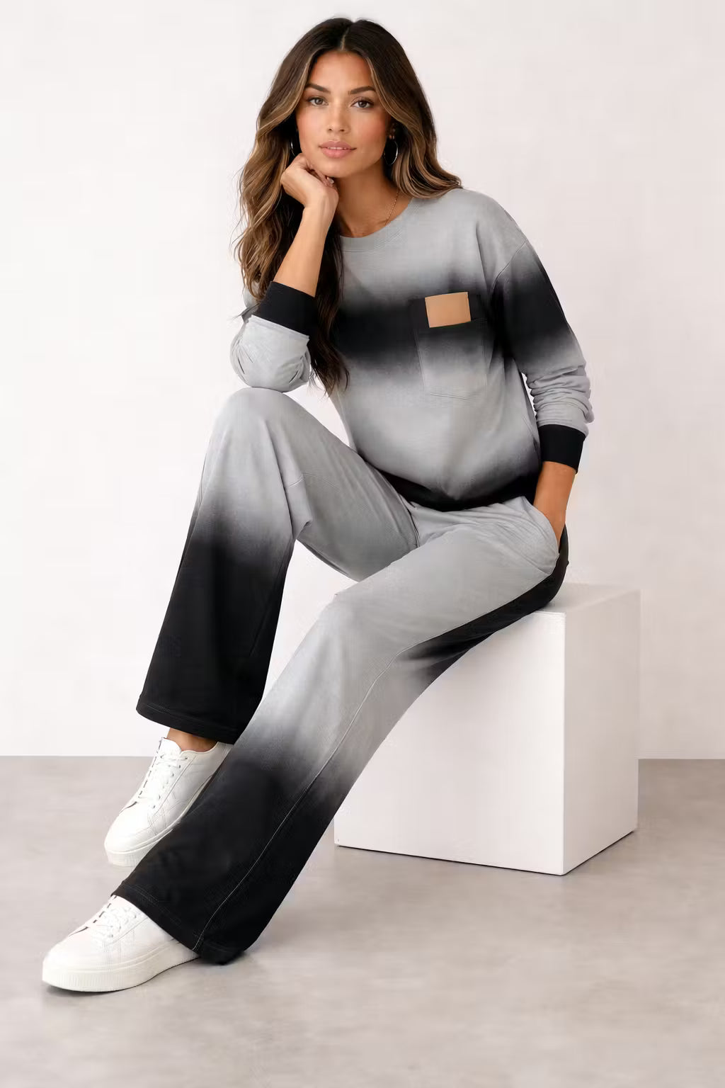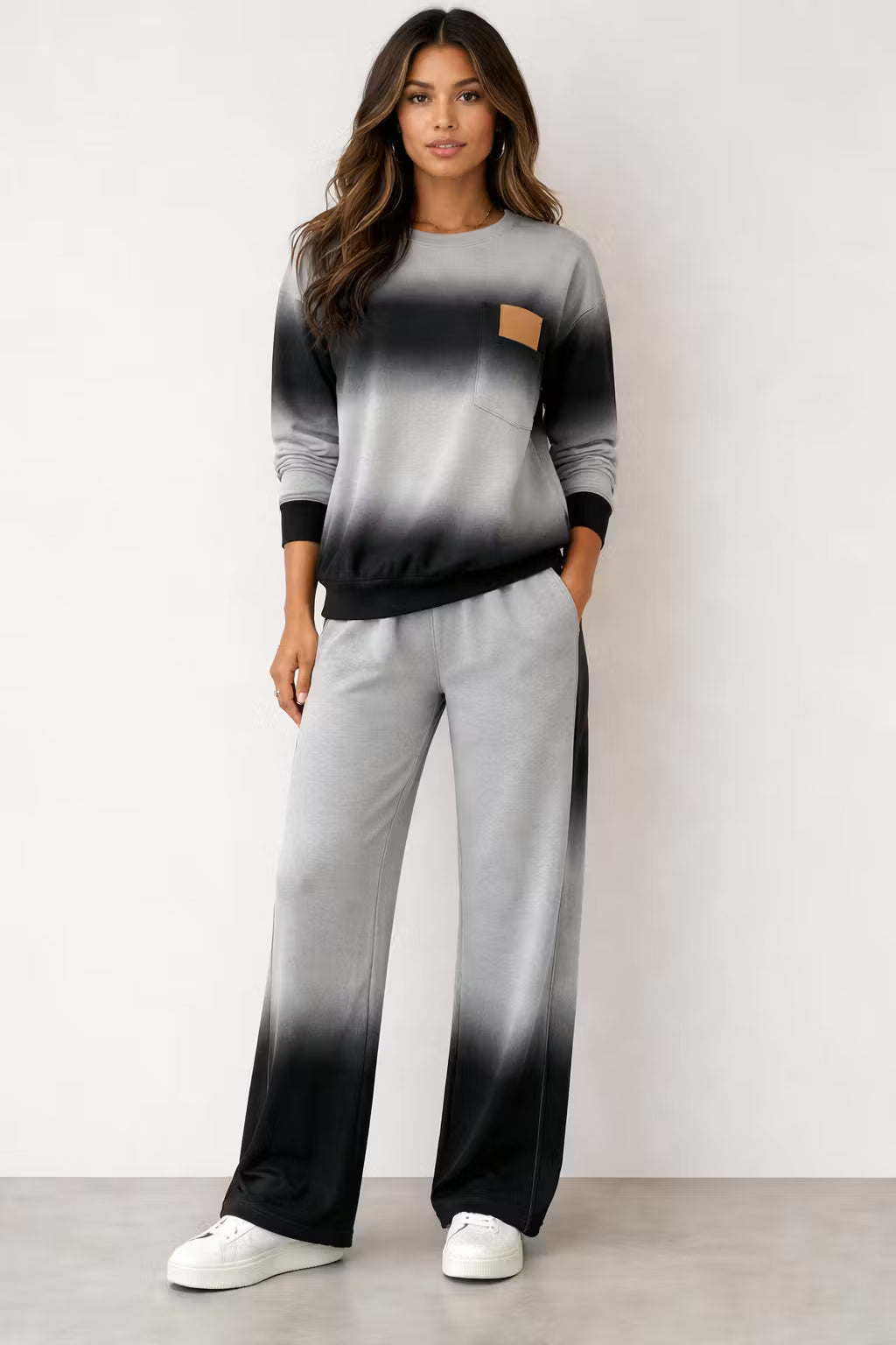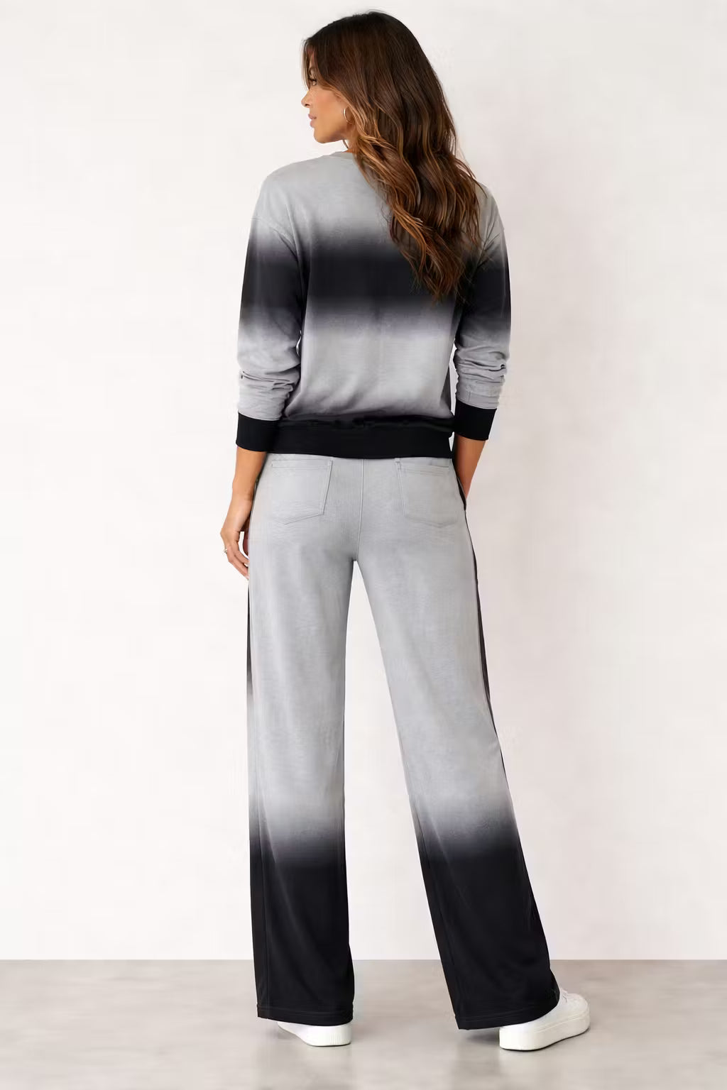 Ten dwuczęściowy zestaw dzianinowy został zaprojektowany z wykorzystaniem tkaniny barwionej gradientowo, tworzącej wizualną głębię w luźnej sylwetce. Góra z długim rękawem łączy się ze spodniami o szerokiej nogawce, tworząc spójny zestaw inspirowany trendem Activewear Elevated. Dzianina zapewnia naturalny układ przy zachowaniu formy sylwetki. Odpowiedni zarówno na chwile poza obowiązkami, jak i do stylu miejskiego o wyrazistym charakterze.