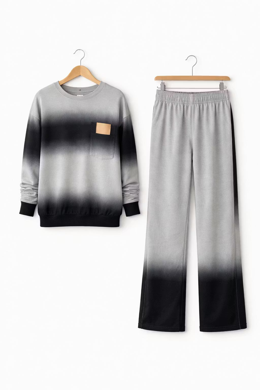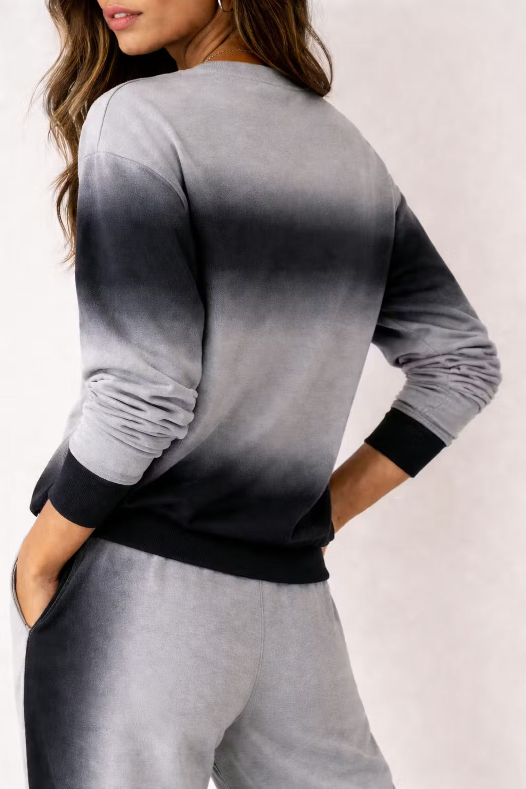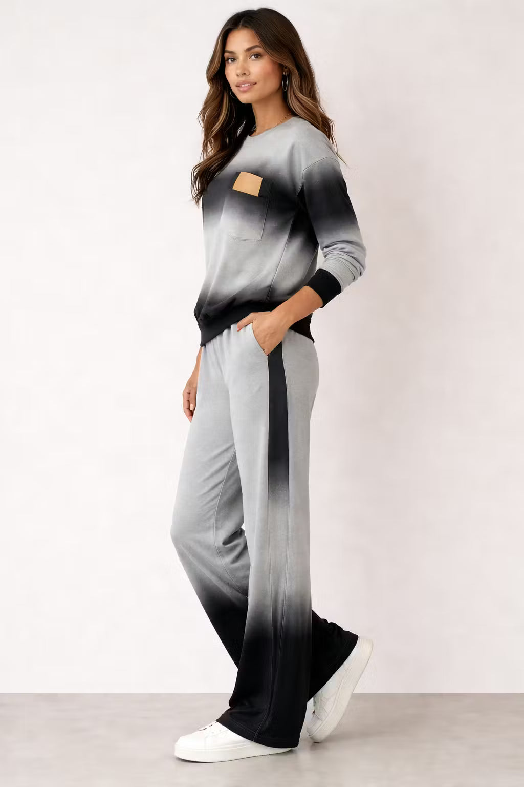 Ten dwuczęściowy zestaw dzianinowy został zaprojektowany z wykorzystaniem tkaniny barwionej gradientowo, tworzącej wizualną głębię w luźnej sylwetce. Góra z długim rękawem łączy się ze spodniami o szerokiej nogawce, tworząc spójny zestaw inspirowany trendem Activewear Elevated. Dzianina zapewnia naturalny układ przy zachowaniu formy sylwetki. Odpowiedni zarówno na chwile poza obowiązkami, jak i do stylu miejskiego o wyrazistym charakterze.
