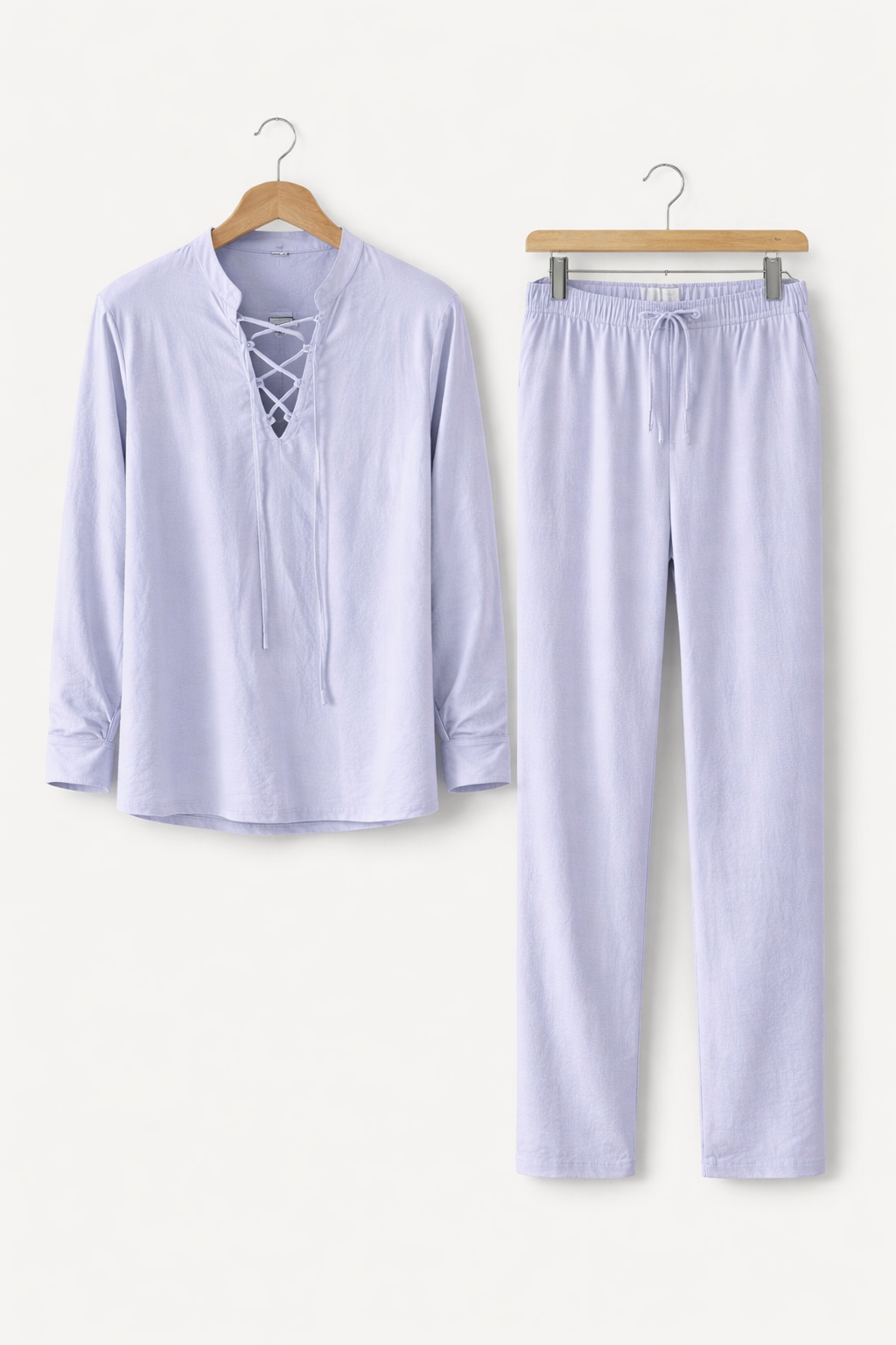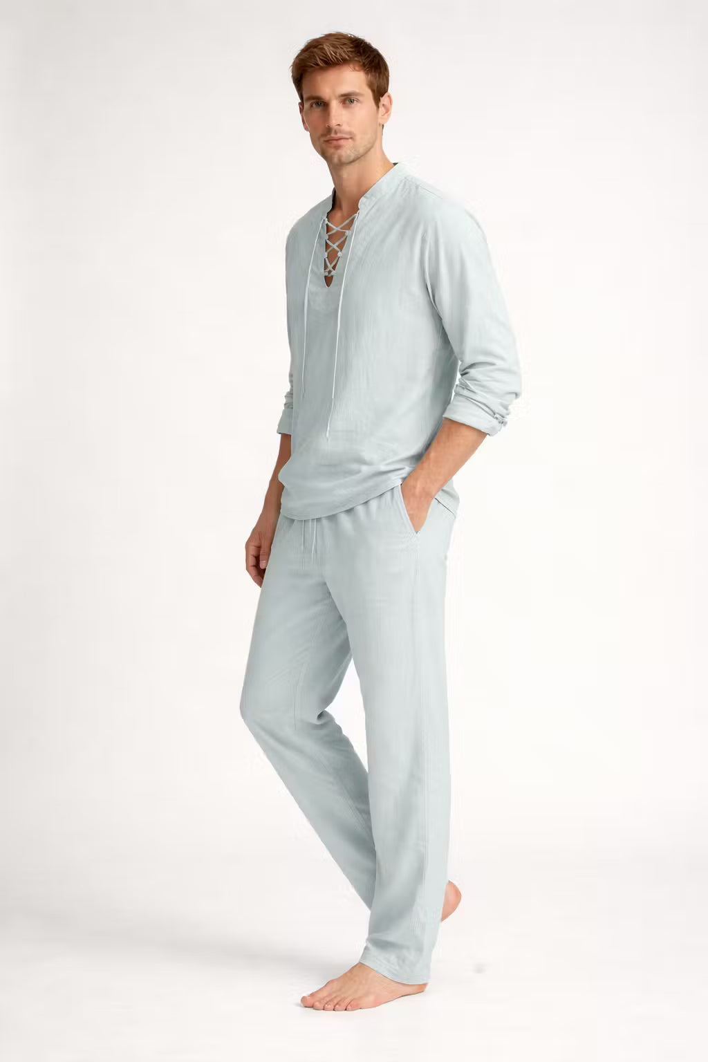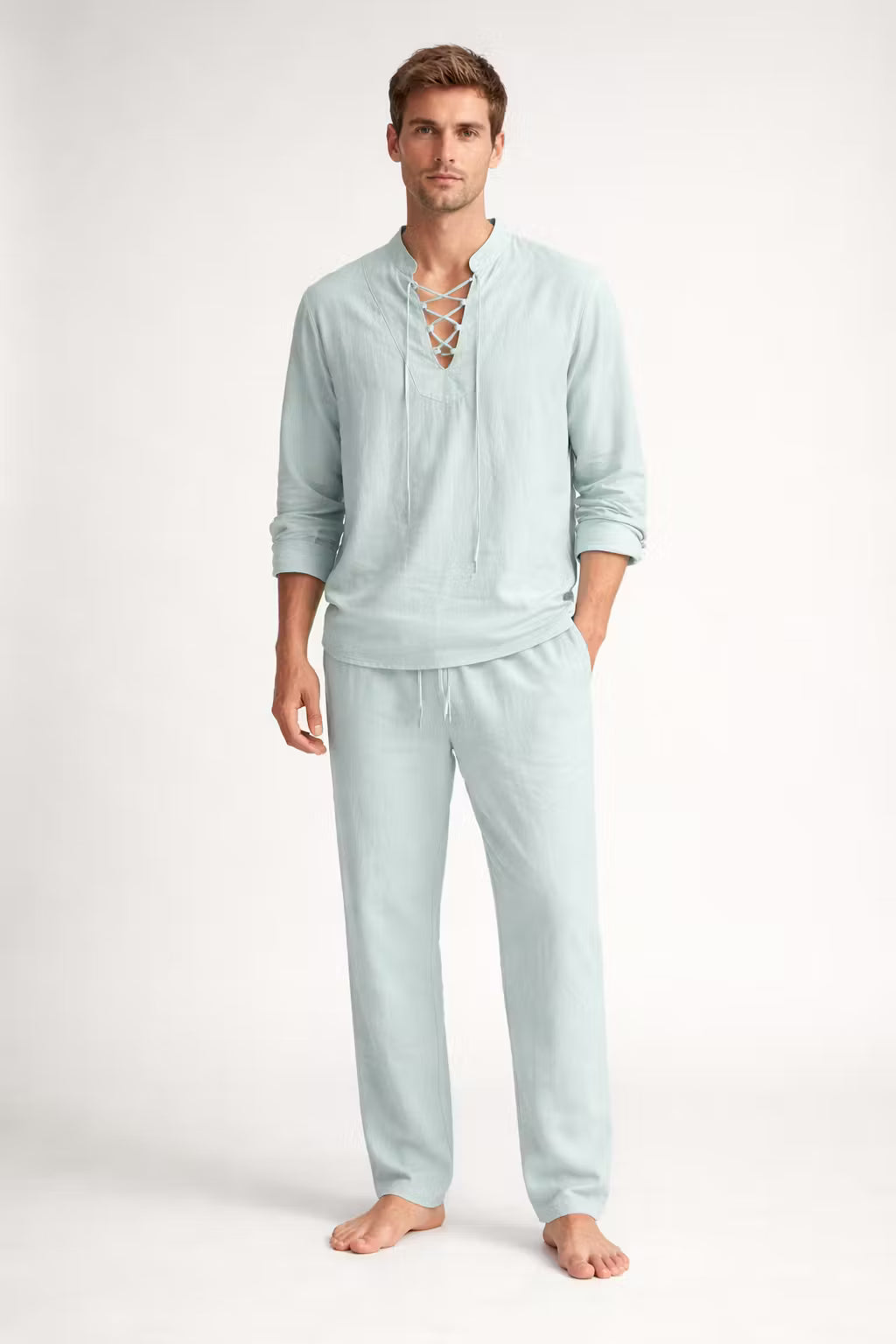 Ten męski komplet został wykonany z tkanej tkaniny o wyraźnej strukturze i naturalnym układzie materiału. Koszula z wiązanym dekoltem nadaje sylwetce swobodny charakter przy zachowaniu czystych linii kroju. Spodnie o pełnej długości uszyto z tej samej tkaniny, tworząc spójną całość. Dwuczęściowy zestaw sprawdzi się podczas wakacyjnych wyjazdów i nadmorskich spacerów.