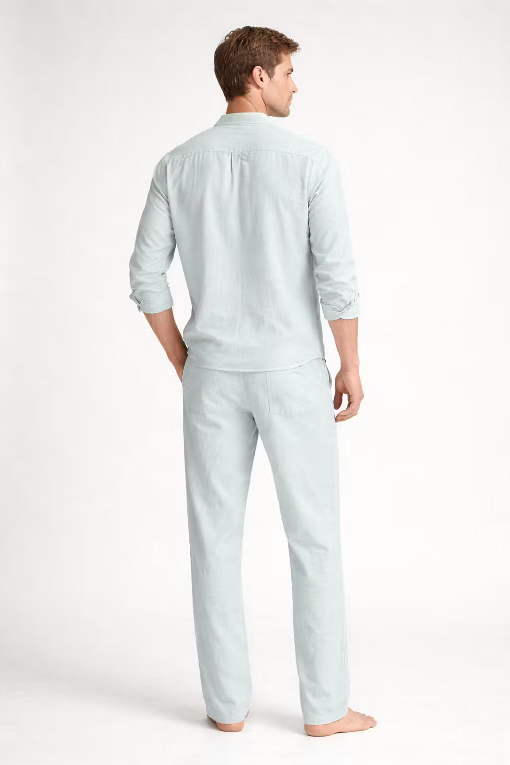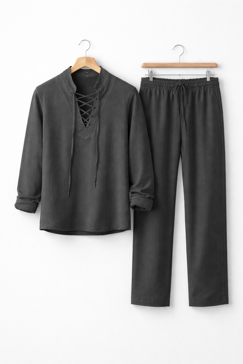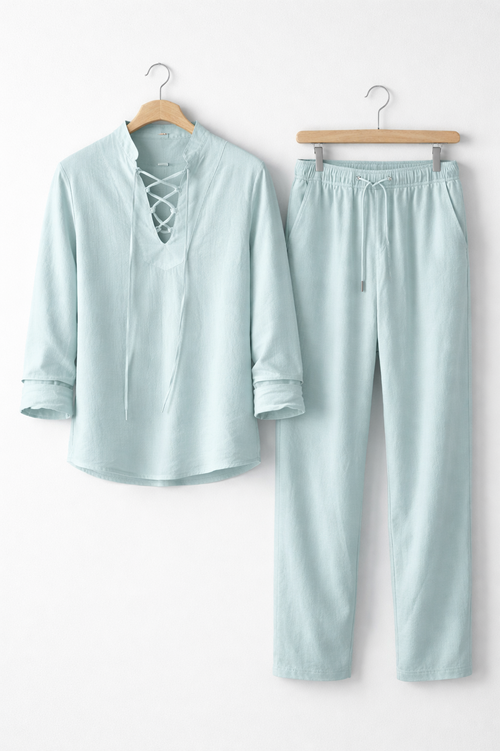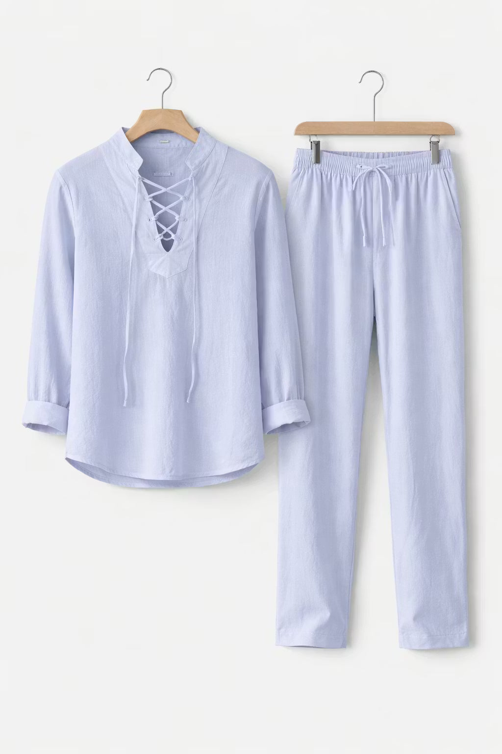 Ten męski komplet został wykonany z tkanej tkaniny o wyraźnej strukturze i naturalnym układzie materiału. Koszula z wiązanym dekoltem nadaje sylwetce swobodny charakter przy zachowaniu czystych linii kroju. Spodnie o pełnej długości uszyto z tej samej tkaniny, tworząc spójną całość. Dwuczęściowy zestaw sprawdzi się podczas wakacyjnych wyjazdów i nadmorskich spacerów.