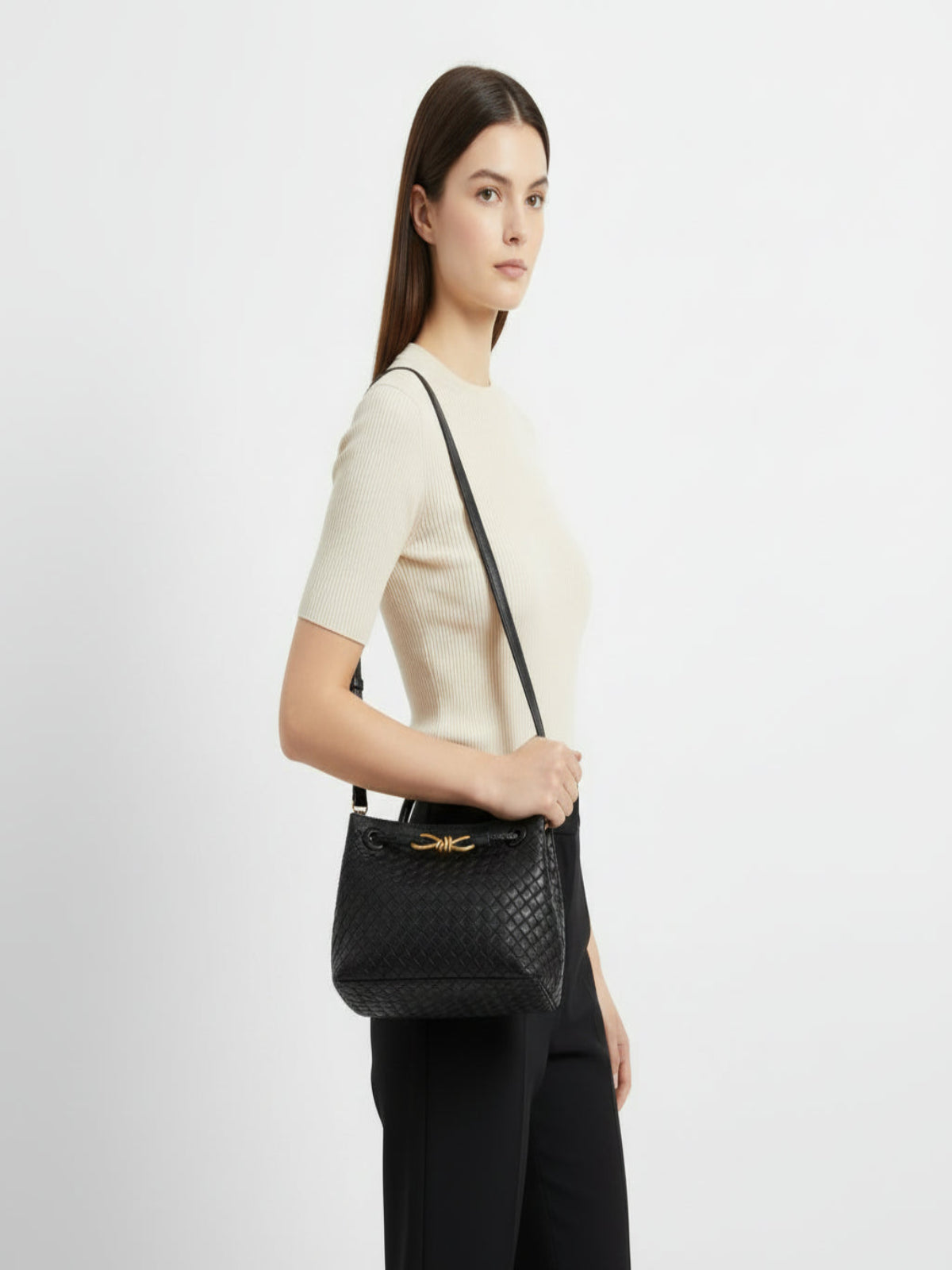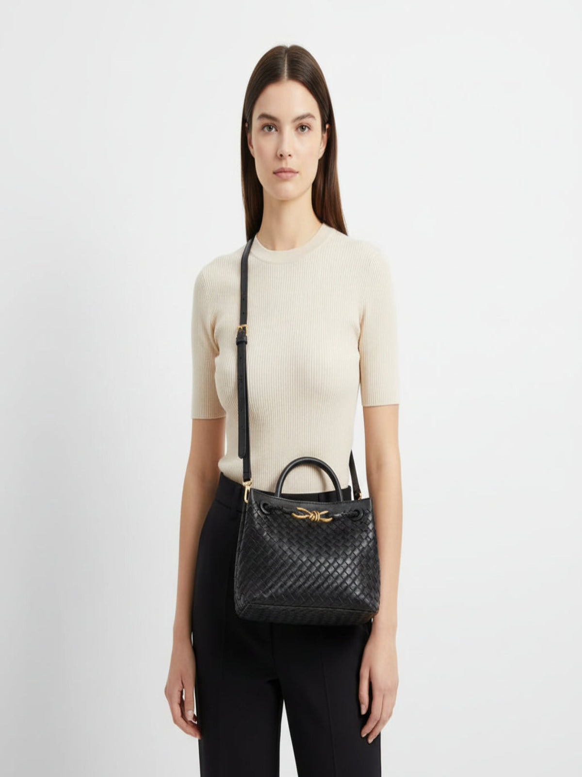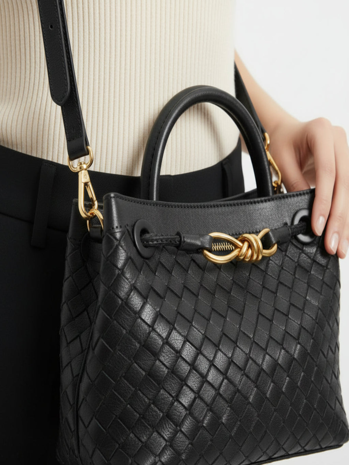 Ta pleciona torebka damska z uchwytem wyróżnia się konstrukcyjną formą oraz dekoracyjną, plecioną powierzchnią z metalowym akcentem węzła. Przeznaczona do noszenia w dłoni, sprawdzi się w miejskich stylizacjach, podczas spotkań oraz wieczornych wyjść. Wnętrze mieści podstawowe przedmioty, takie jak telefon, karty i klucze. Zachowuje estetyczny kształt podczas użytkowania.