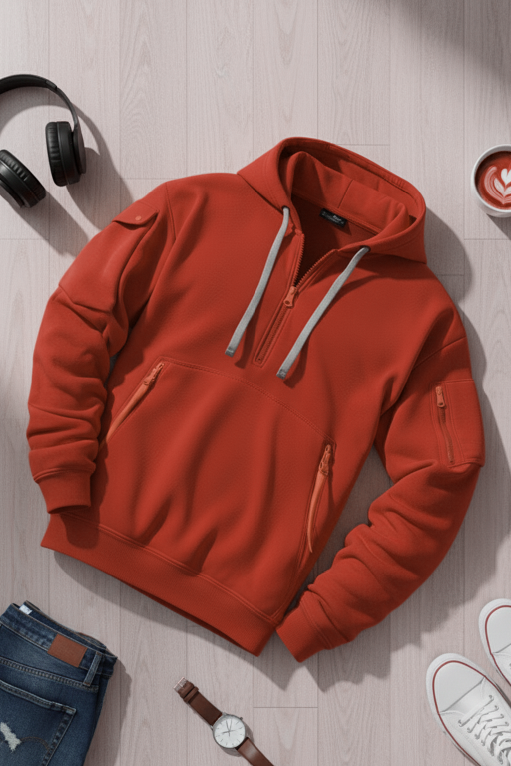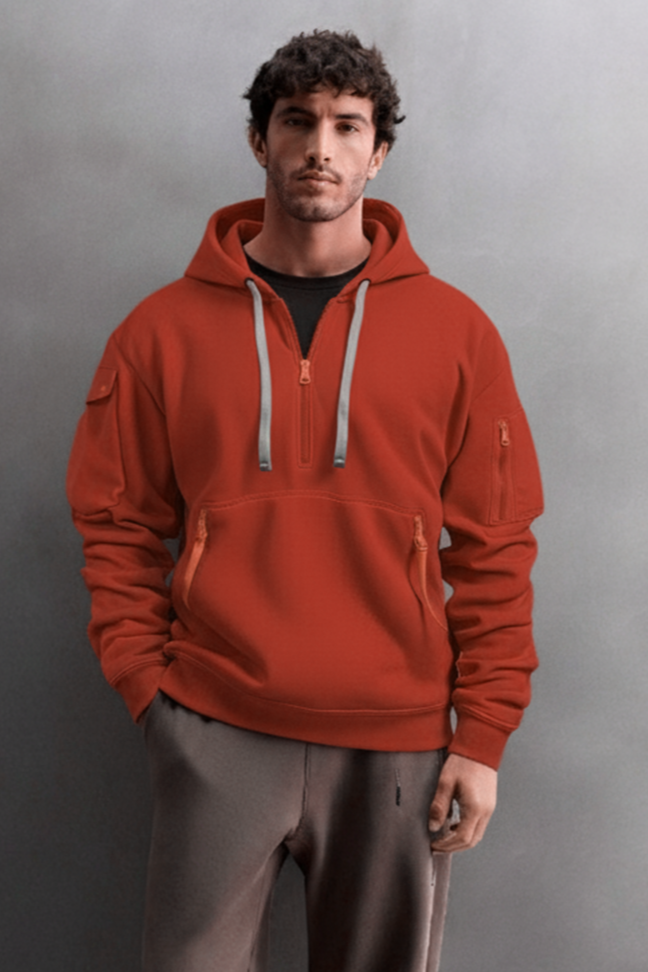 Bluza Krzysztof wyróżnia się mocnym ceglanym odcieniem, podkreślonym kontrastowymi zamkami, które nadają jej nowoczesnego charakteru. Pół-zamek zapewnia wygodę noszenia i możliwość warstwowania, a przestronne kieszenie i regulowany kaptur zwiększają funkcjonalność. To współczesna bluza, która łączy wygodę, trwałość i wyrazisty kolor w jednym projekcie.