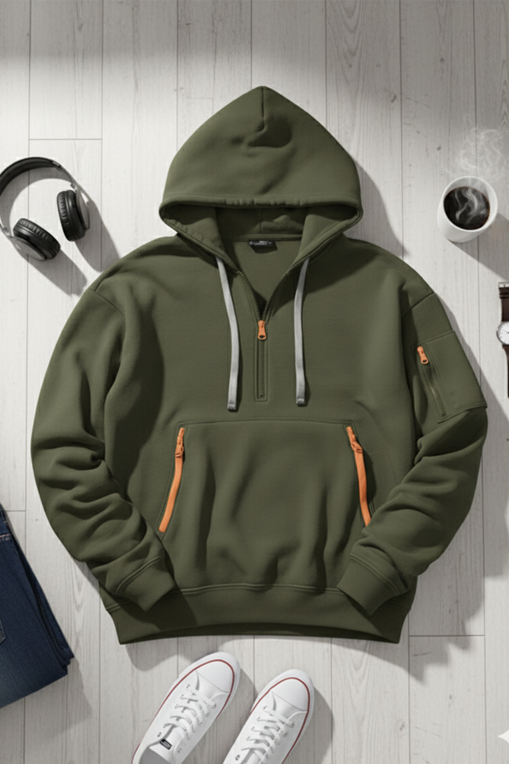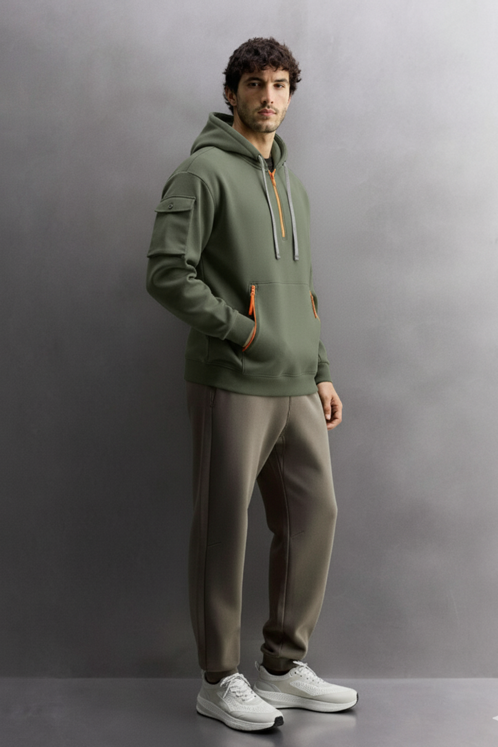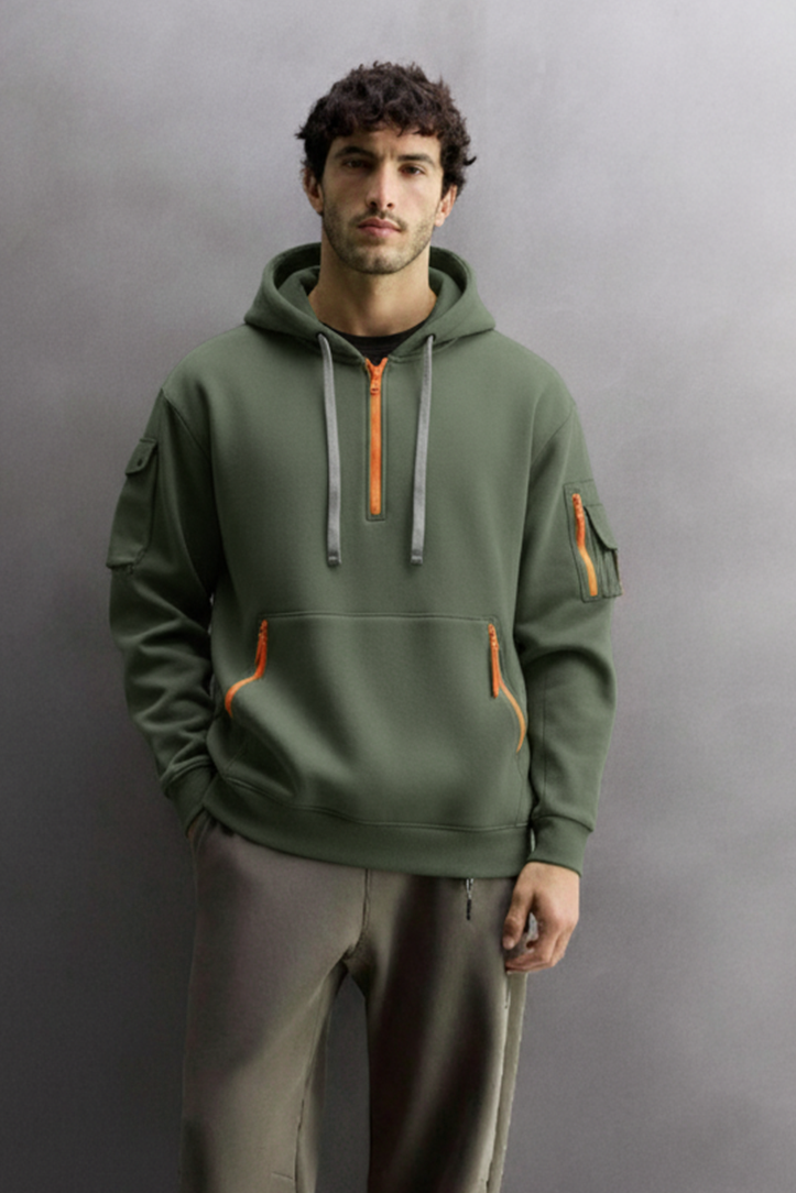 Bluza Łukasz łączy naturalny oliwkowozielony odcień z kontrastowymi zamkami, tworząc uniwersalny wygląd, który balansuje pomiędzy surowym stylem a nowoczesnym designem. Pół-zamek ułatwia zakładanie i warstwowanie, a regulowany kaptur oraz praktyczne kieszenie sprawiają, że bluza doskonale sprawdza się na co dzień. Idealna zarówno na świeżym powietrzu, jak i w miejskich stylizacjach – zapewnia wygodę i charakter w jednym.